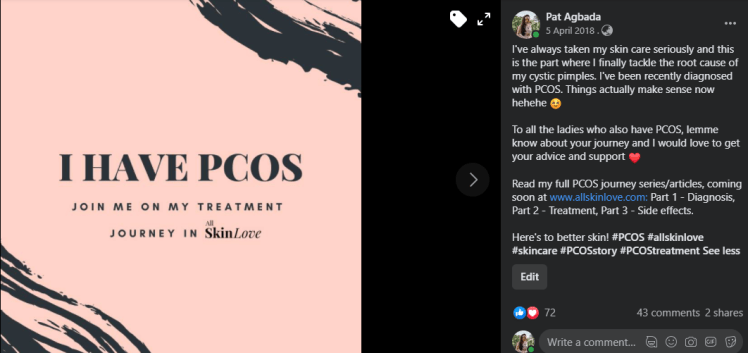 I want to thank all those who have been very supportive of my PCOS journey blog when I posted about having PCOS in my Facebook profile and Facebook page All Skin Love. 🙂